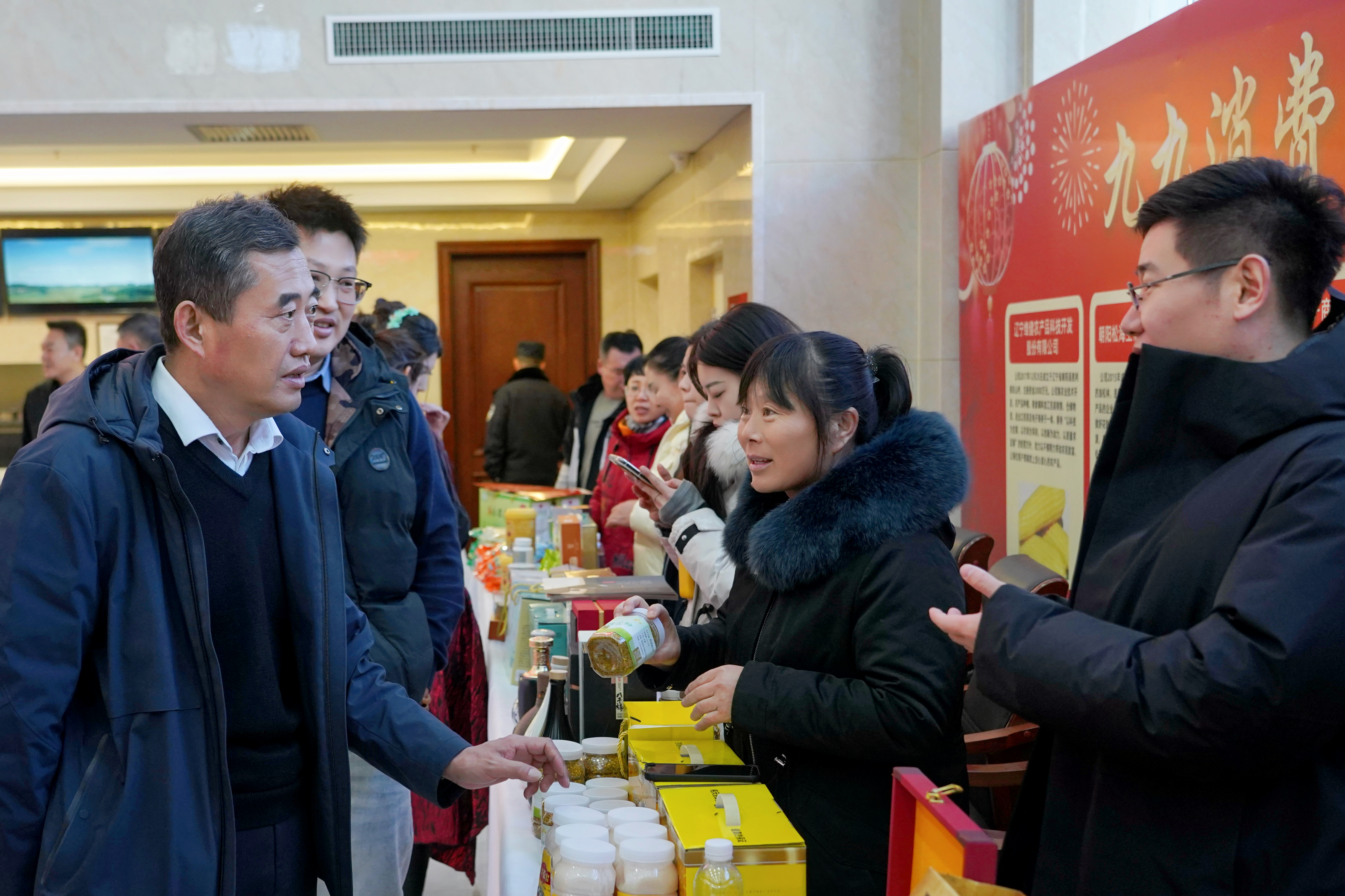 活动现场氛围热烈祥和,欢快的新春背景音乐萦绕耳畔,整个大厅内充满欢声笑语。特色产品展销区内,优质粮食颗粒饱满、畜禽产品香气扑鼻、农产品深加工制品等琳琅满目,全方位展现了我县的生态好物与丰收成果。