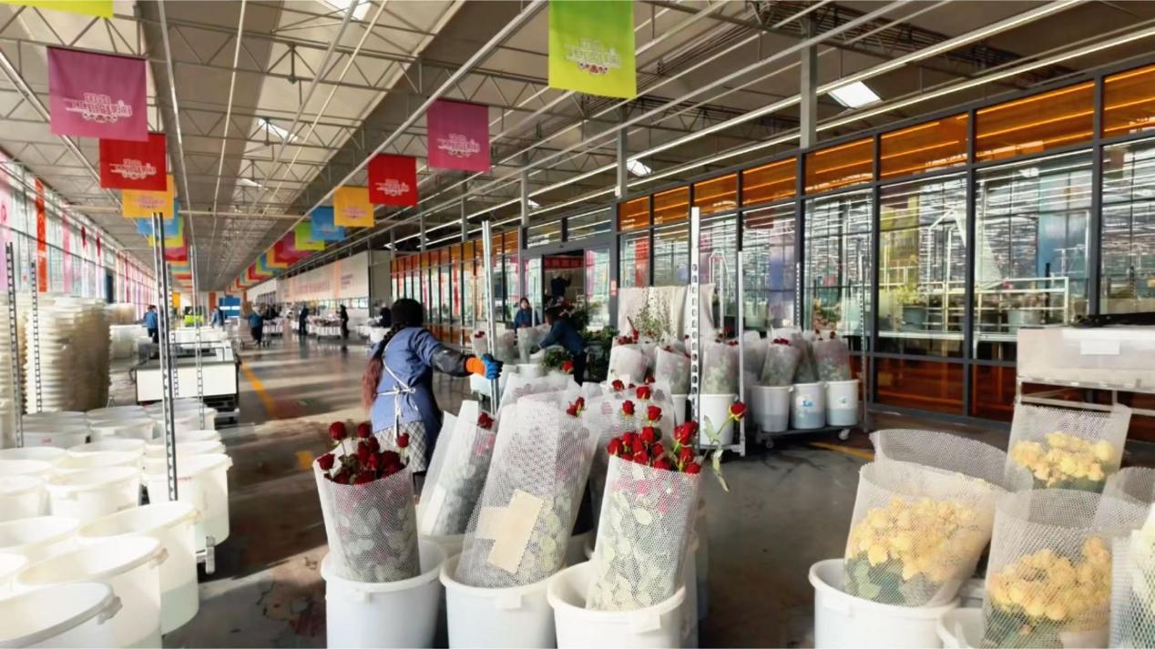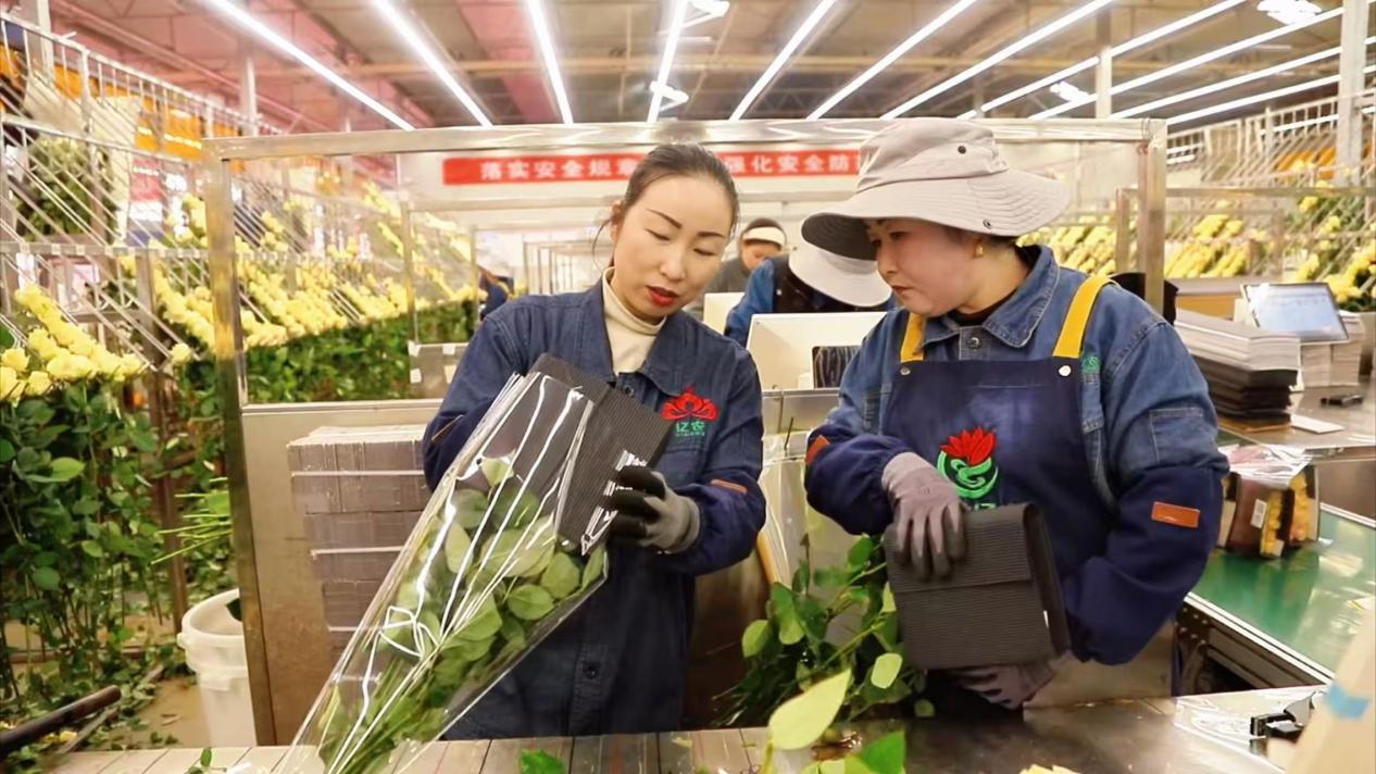基地里,玫瑰以每40天一茬的速度茁壮生长,日产鲜切花达20万枝。企业提供了超过500个就业岗位,不仅吸引本村村民,还有很多来自周边县区的务工者。许多像婷婷一样的女工,在这里找到了人生第一份工作。
